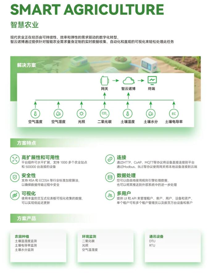诺博智慧农业是以信息和知识为核心要素,通过将互联网、物联网、大数据、云计算、人工智能等现代信息技术与农业深度融合,实现农业信息感知、定量决策、智能控制、精准投入、个性化服务全新的农业生产方式,是农业信息化发展从数字化到网络化再到智能化的高级阶段。
