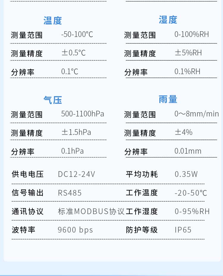 微型超声波多参数传感器是一款全数字化检测,高精度传感器,是由超声波原理风速风向传感器、高精度数字温度、湿度、气压传感器、压电式雨量传感器集成,可准确、快速检测出风速、风向、大气温度、大气湿度、大气压力、降雨量,内置信号处理单元能根据用户需求输出相应信号,可选配噪声、照度、PM2.5、PM10等传感器。高强度结构设计可在恶劣气候环境中可靠工作,外观结构小巧,集成度高,质量轻,坚固耐用。可广泛用于气象、环境、机场、港口、实验室、工农业及交通等领域。