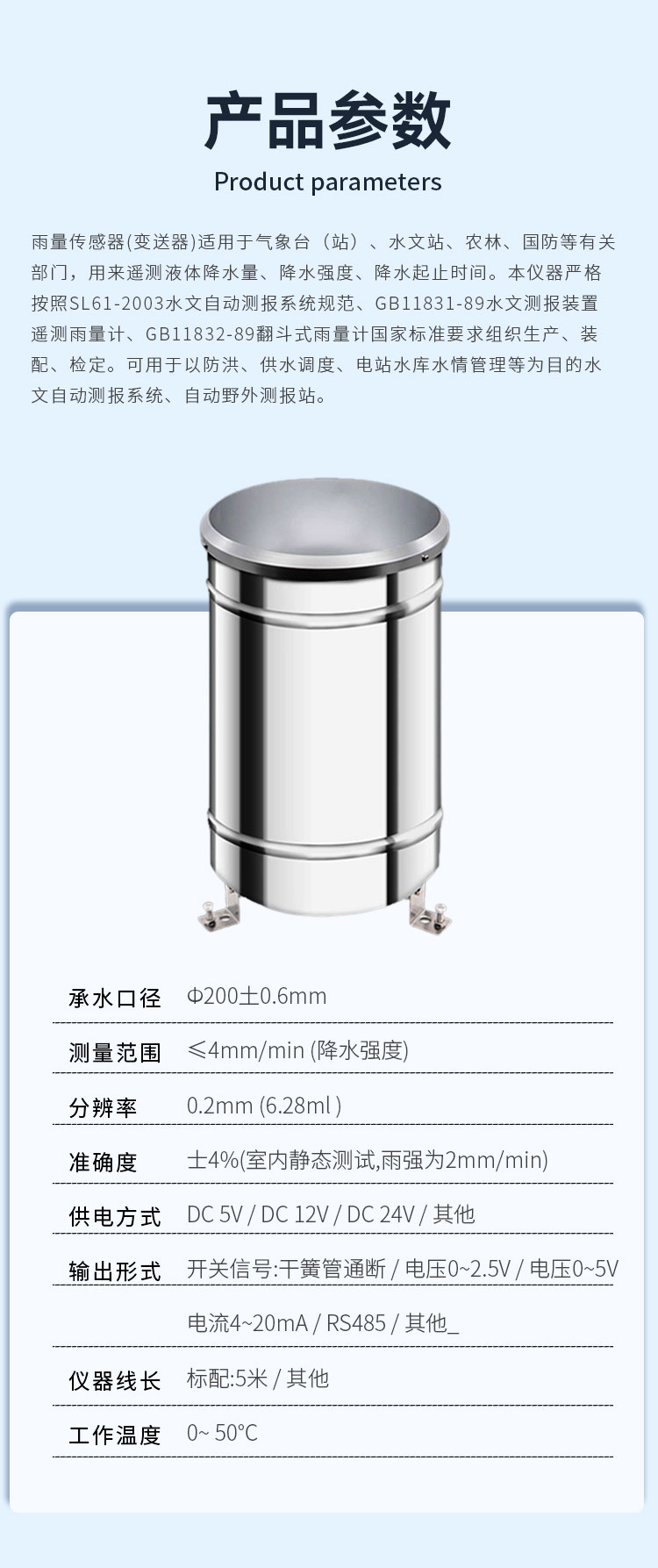 翻斗式雨量计国家标准要求组织生产、装配、检定。可用于以防洪、供水调度、电站水库水情管理等为目的水文自动测报系统、自动野外测报站。