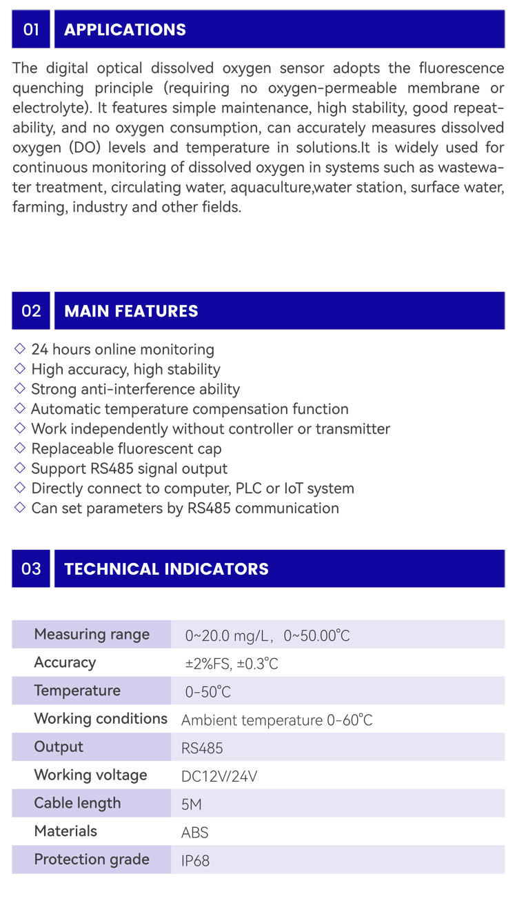 The Galvanic Cellmethod dissolved oxygen digital sensor is a new generation of intelligent water quality detection digital sensor independently developed by Nobotech. It can check, calibrate, maintainthrough mobile phone or computer. It’s easy to maintenance, with high stability and good repeatability. Its’ function it to test the DO value and temperature of liquid. It is widely used in wastewater treatment, purified water, circulating water, boiler water and other systems as well as continuous monitoring of dissolved oxygen values in solutions such as electronics, aquaculture, food, printing and dyeing, electroplating, pharmaceutical, fermentation, chemical and other farming and tap water.