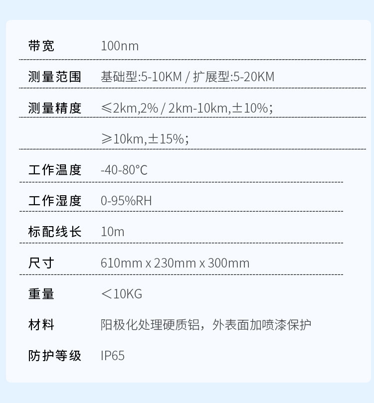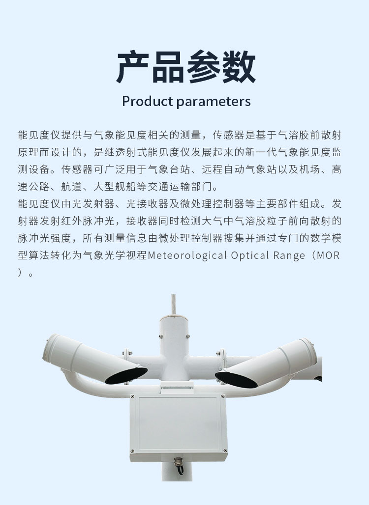 能见度仪提供与气象能见度相关的测量,传感器是基于气溶胶前散射原理而设计的,是继透射式能见度仪发展起来的新一代气象能见度监测设备。传感器可广泛用于气象台站、远程自动气象站以及机场、高速公路、航道、大型舰船等交通运输部门。