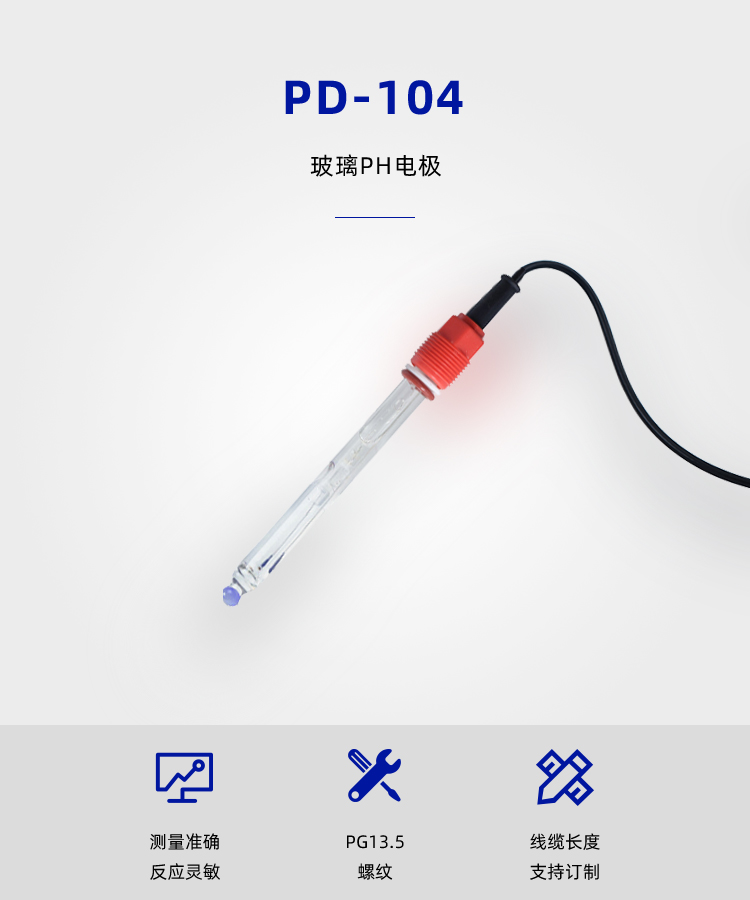 广西工业水质检测仪 pH玻璃电极 PD-104 用途: 一般用于水处理、制药、生物工程,啤酒、食品与饮料等场合。 规格: 测量范围:0~14pH 温度范围:0-130℃ 耐压:0.6MP 安装尺寸:PG13.5螺纹 材质:采用新型耐高温玻璃敏感膜。 联接方式:低噪音电缆直接引出 尺寸:直径12×120mm