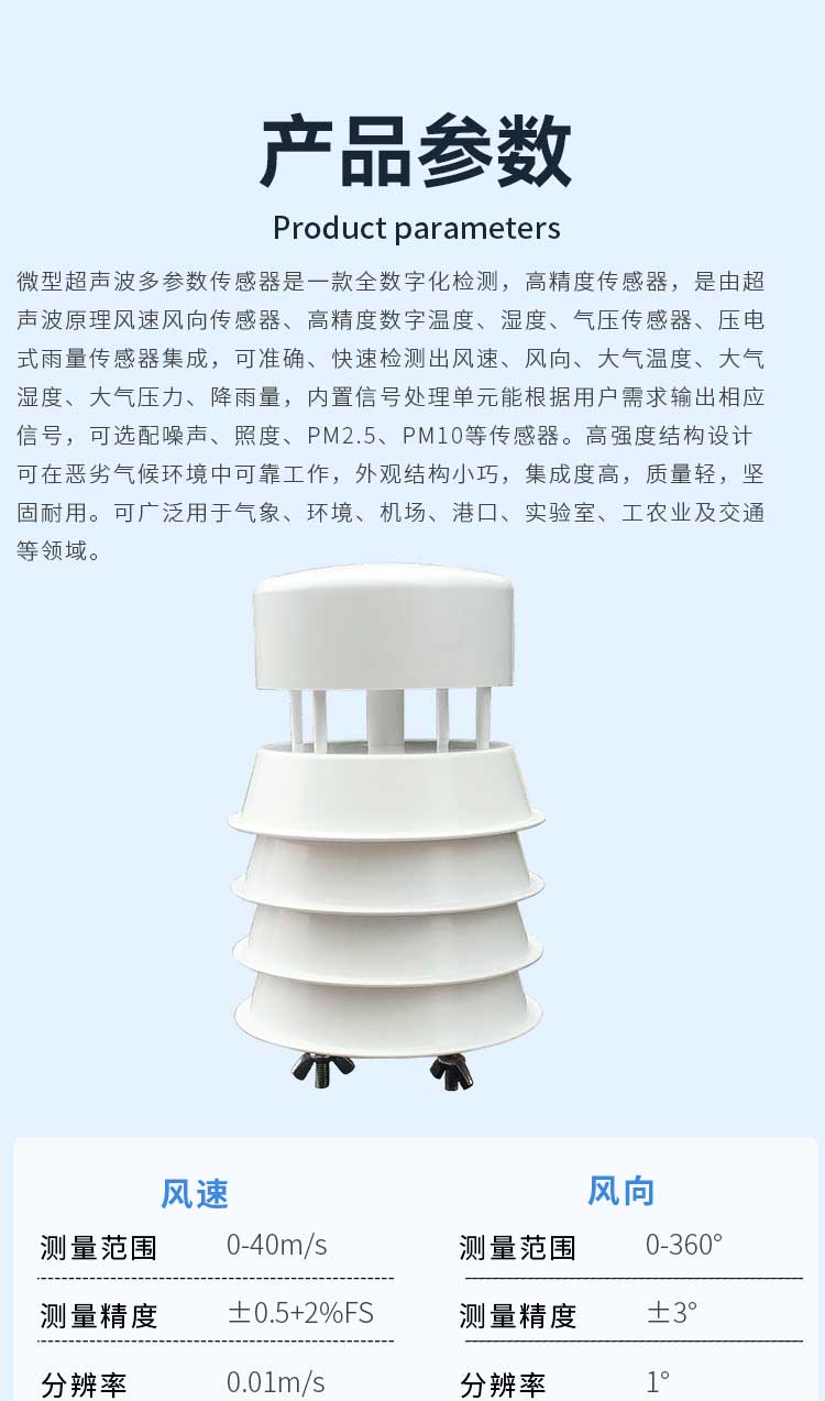 微型超声波多参数传感器是一款全数字化检测,高精度传感器,是由超声波原理风速风向传感器、高精度数字温度、湿度、气压传感器、压电式雨量传感器集成,可准确、快速检测出风速、风向、大气温度、大气湿度、大气压力、降雨量,内置信号处理单元能根据用户需求输出相应信号,可选配噪声、照度、PM2.5、PM10等传感器。高强度结构设计可在恶劣气候环境中可靠工作,外观结构小巧,集成度高,质量轻,坚固耐用。可广泛用于气象、环境、机场、港口、实验室、工农业及交通等领域。